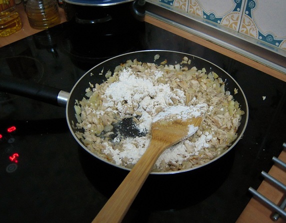 4. Después de los 10 minutos, es el momento de añadir poco a poco cucharadas de harina. Este momento es crucial para que luego no nos quede un mazacote. Aproximadamente, son 4 cucharadas soperas generosas de harina.