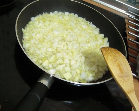 2. Dejamos pochar primero la cebolla. Piensa que el pollo ya está hecho por lo que no necesita que lo cocinemos. Esperamos hasta que la cebolla esté blandita cocinando a fuego medio-alto, es decir, del 1 al 10, pues un 6/7.