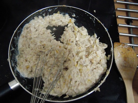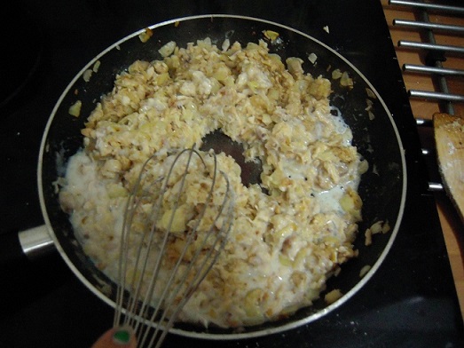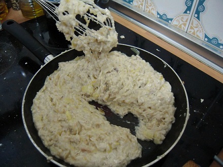 6. Ahora sólo queda añadir poco a poco la leche mientras vamos removiendo con un tenedor o unas varillas. Las son del chino por 0,80 €. Os pongo el proceso de como va quedando la masa según se añade la leche. OJO DATO! No olvidéis echarle sal y echar pimienta (hay gente que echa también nuez moscada), y por supuesto, de ir probando poco a poco.