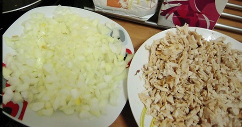 1. Pica bien la cebolla y haz miguitas/tiritas con la carne del pollo, que quede en hilos. Nosotros hemos usamos la carne de una pechuga y un poquito más para la receta de hoy.