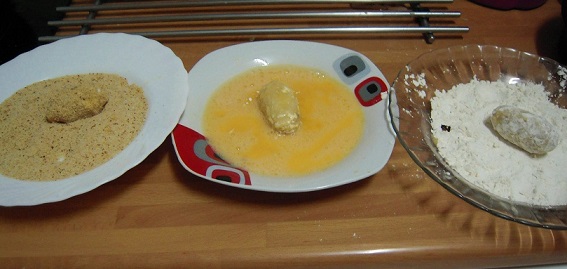 7. Para rebozar las croquetas, recordad: Harina + Huevo + Pan Rallado, repetid conmigo… Harina + Huevo + Paaaannn Ralladooo… En este orden siempre. Bien, si ya tenéis esto entendido, podéis empezar a montarlas. Hacéis la forma que os de la gana, la rebozáis en harina, la pasáis por huevo (añadid al huevo un toquecito de sal) y luego al pan rallado. Cuando esté el aceite muy caliente, a la sartén, vuelta y vuelta y a correr!!!