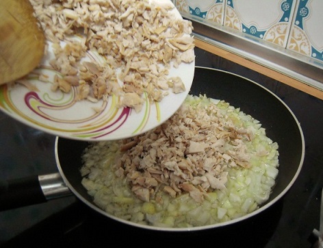 3. Cuando la cebolla esté rendidita añadimos las migas de pollo a la sartén y bajamos el fuego como al 4. Dejamos que todo se cocine junto durante unos 10 minutos mezclando bien.