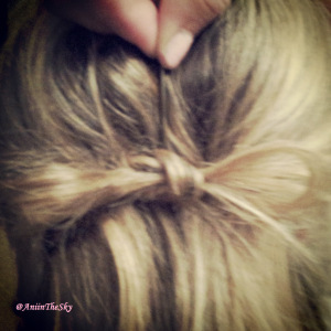 Este es muy fácil porque es como atar un par de cordones de zapatos que están en tu nuca, suena raro, pero puedes hacerlo sin pensar demasiado ya que es un movimiento que más o menos todos tenemos mecanizado. Yo prefiero hacerlo con poquito pelo para que se vea mejor y quede más definido, pero podéis probar. Vamos al lio: