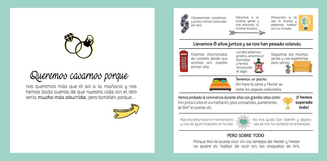 Para nosotros la invitación de la boda no era un papel en el que poner datos de una manera bonita. Todo lo contrario. Queríamos transmitir el espíritu de los dos por separado, de nosotros juntos y transmitir lo que queríamos que fuera nuestro gran día. De ahí que pusiéramos el 100% en ella.