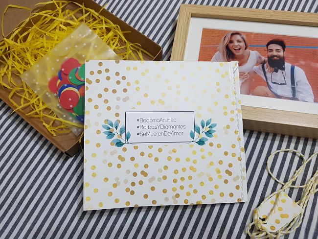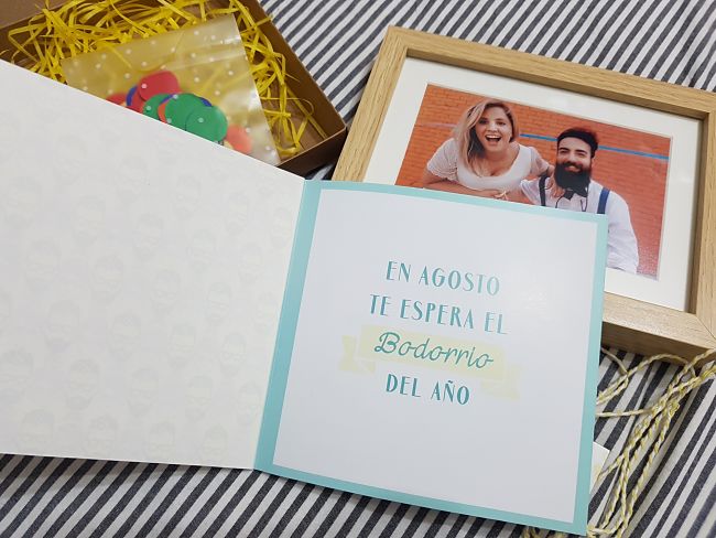 El resultado de todo es una invitación de la que estamos super orgullosos. Hemos recibido muchísimas felicitaciones por hacer algo tan original y que contara nuestra historia. Además, como pedimos a los invitados que nos mandaran fotos de ellos abriendo la invitación y celebrando con el confeti, tenemos una carpeta llena de fotos y vídeos de esos momentos y nos encanta!!!