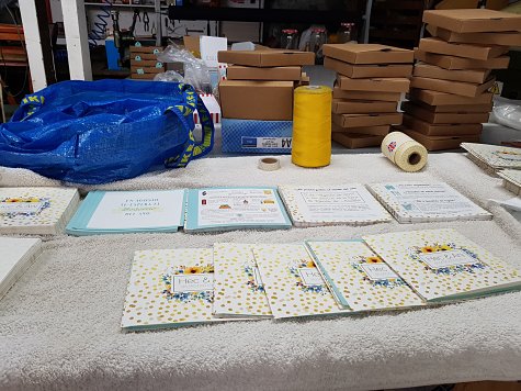 Las cajas las preparamos entre el sofá de casa y el taller de Narci. Venían sin montar así que nos tocó hacer manualidades. También tuvimos algún que otro problema al coger las hojas y colocarlas: algunas que van juntas y al final pones dos, se nos olvidaba uno de los pasos… Pero como habíamos hecho algunas extra, cero problemas. Los pasos siguientes fueron: meter el relleno de papel dentro de la caja y el confeti, meter después la invitación, cerrar con hilo Bakers Twine amarillo y por último añadir el nombre del destinatario y asegurar con el washi tape de lunares. La coherencia hasta en el washi tape, señores.