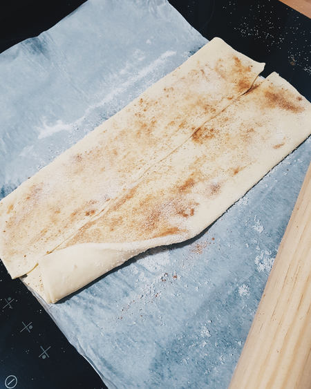 6 Llegó el momento de doblar la masa por última vez. Para hacerlo llevamos un extremo encima del otro y ponemos más azúcar por fuera.