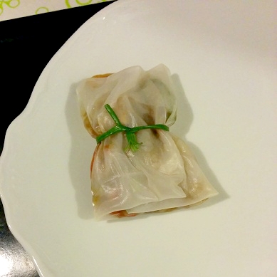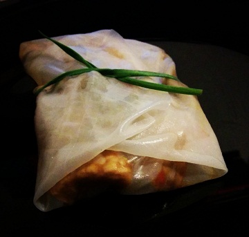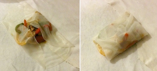 Humedecer un paño limpio y ponerlo en la encimera. Meter la torta en agua caliente hasta que se hidrate y se pueda moldear. Extender la torta en el paño y añadir el guiso del wok. Para cerrar, hacerlo primero por dos laterales y luego cerrarlos con los otros, justo como en la imagen: