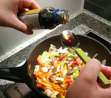 Para las salsas, nosotros las añadimos directamente en el wok, otra idea es macerar el pollo una tarde en salsa teriyaki para que coja sabor. En nuestro caso, queríamos que todo supiera a teriyaki, así que lo añadimos directamente mientras cocinábamos.