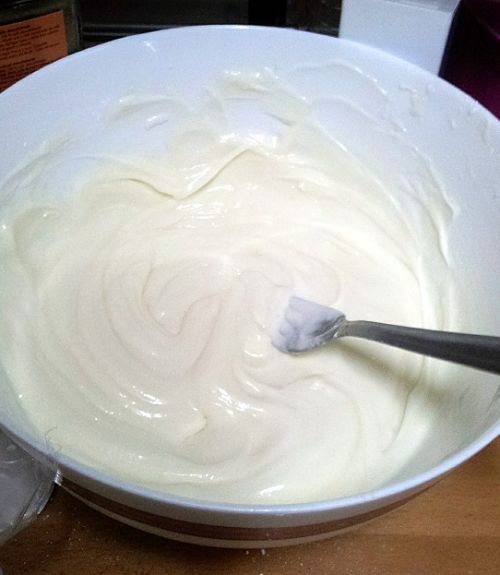 12º Cuando la nata esté montada (y tú llorando de dolor si lo hiciste a mano), vamos a ir añadiéndola poco a poco a la mezcla del punto 10, despacio para que se mezcle todo y no se baje. La textura que tendremos que conseguir es algo así:
