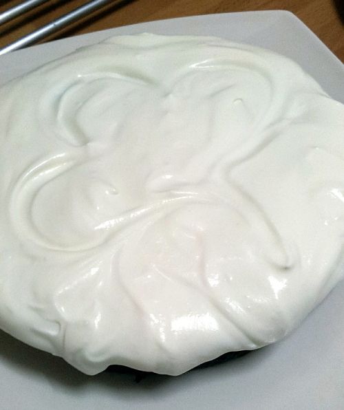 13º En este momento ya tendremos el bizcocho de Guinness frío para recubrir con el frosting a modo espuma. La técnica es tan fácil como ir tirando pegotes por encima y alisando con un tenedor. Nosotros hicimos a modo de decoración un trébol que duró nada, pero bueno, le daba un toque irlandés.