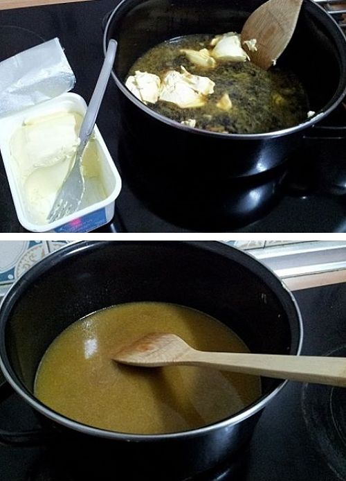 2º A esa Guinness que está dejando un olor alcoholico en toda la cocina, tenemos que añadir los 250 gramos de mantequilla. Hala! a lo loco! a tomar por saco las últimas 2 semanas de spinning. Y removemos hasta que todo esté disuelto.