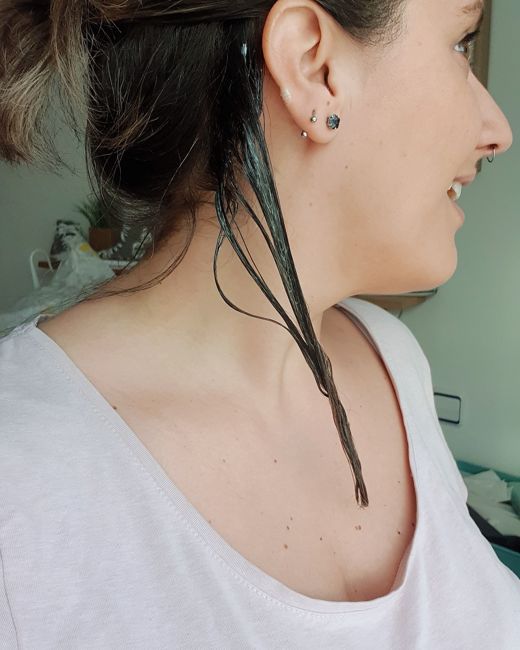 Ya has escogido la marca de tinte para el pelo que quieras y el color que mejor te va. Ahora toca teñir. Antes de nada, mi consejo es que hagas una prueba en un mechón de la nuca para ver cómo queda y evitar reacciones alérgicas. Yo fue lo primero que hice para no asustarme. Mezclé la misma cantidad de developer cream y de tinte en un vasito y me lo apliqué. Como la prueba ni me dio alergia ni me varió mucho el tono, decidí aplicar el tinte en toda la cabeza. No sé para qué subo la foto en la que me hago la prueba, tengo unas pintas que que no me hacen justicia, pero aquí no hemos venido a ser monas, hemos venido a contar una experiencia.